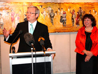 Australian Prime Minister Kevin Rudd makes comments on renowned Chinese artist Guan Wei's work "Tracing Downing Ned Kelly, No. 2" at the opening ceremony of the "Southern Skies" exhibition on April 9, 2008. (Xinhua Photo)