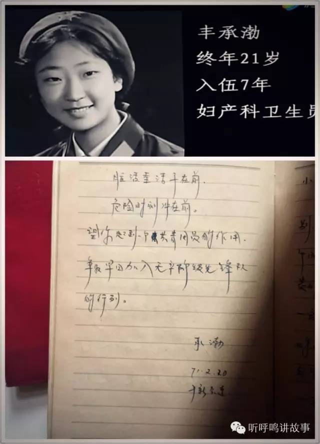 丰承渤,是我新兵连一个班的战友,她内向自律,整洁安静,我们曾经一起站过岗,她教会我生炉子。新兵训练结束时,她给我写了临别赠言是:脏活累活干在前,危险时刻冲在前。望你起到一个共青团员的作用,争取早日加入无产阶段先锋队的行列。——承渤,71.2.20于新兵连。她分配到唐山二五五医院,直到有一天我听到一篇报告文学《唐山大地震》时,听到了她的名字。28日晚她正在值夜班……压在废墟中至到牺牲前,还让别人为她梳了梳长发。
