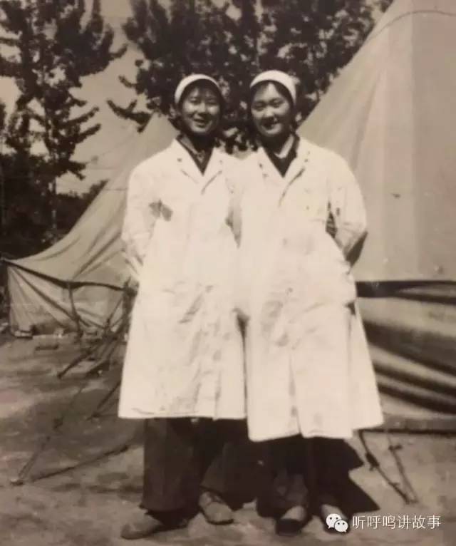 1977年10月,二五四医院在地道对面,外二科地震棚病房前,护士李芳和护士孙彦军