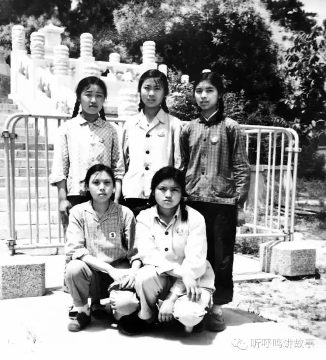 这是比我稍大的朋友。前排左起:王小玲、许继援。后排左起:王建林、董立平、吕晓玲。她们那时也是刚上初中,我很喜欢听她们讲话,其中王小玲是和我住在一个单元。小玲的嗓子特好,后来她差点去考音乐学院。