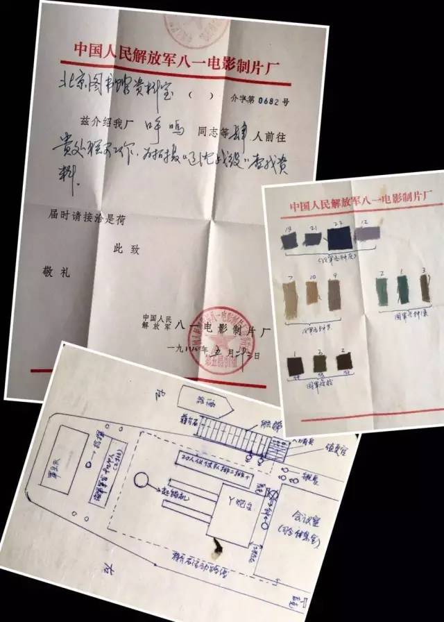 这是当时八一电影厂给开的介绍信,我选的《辽沈战役》的服装颜色小样,和重庆号上的人员分布平面图